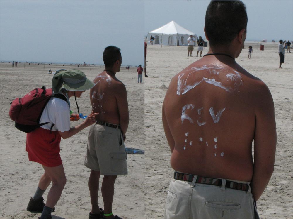 Barb helps Bob with sunscreen (incl. Braille Rev)