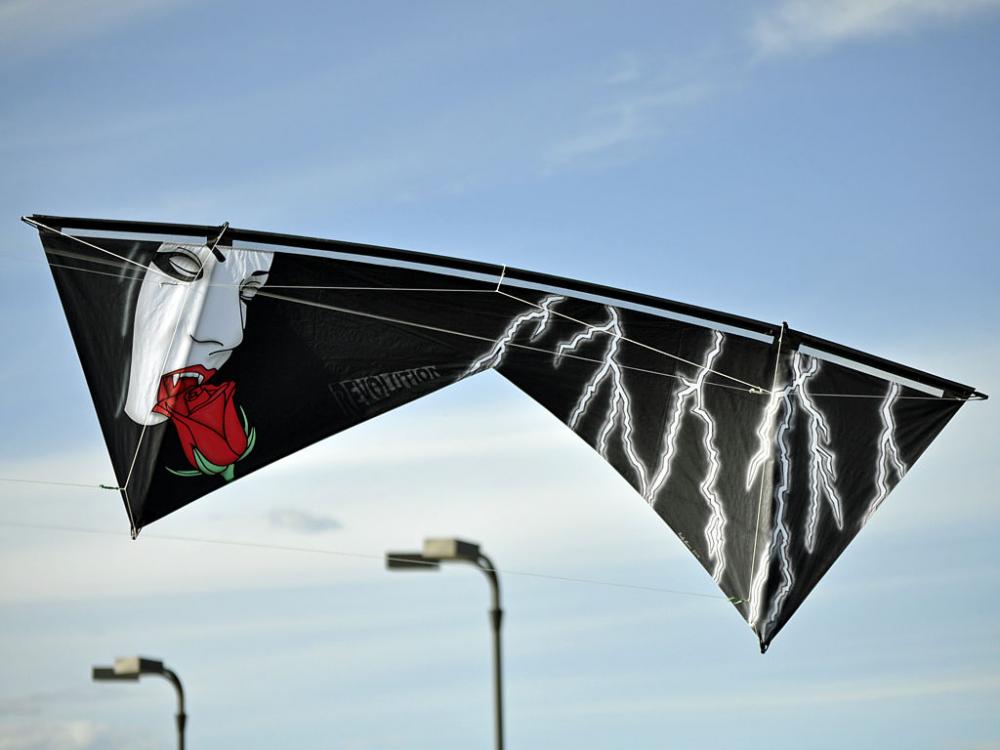So, my beautiful wife seen this kite and ordered it immediately right from Lolly without me even knowing it existed. LOL So this is officially "Her" Rev. Yea, she's a twilight fan and she really fell in love with this one. The skin was designed/sewn by Randy Tom, finish work on the leading and trailing edge was done by Bazzar just like the Pro's. This is an awesome looking kite. There is a slight tint of purple around each of the lightning bolts and it really pops out against the total black background. I will have to try and get a close up picture of the rose as the detail in that is stunning.