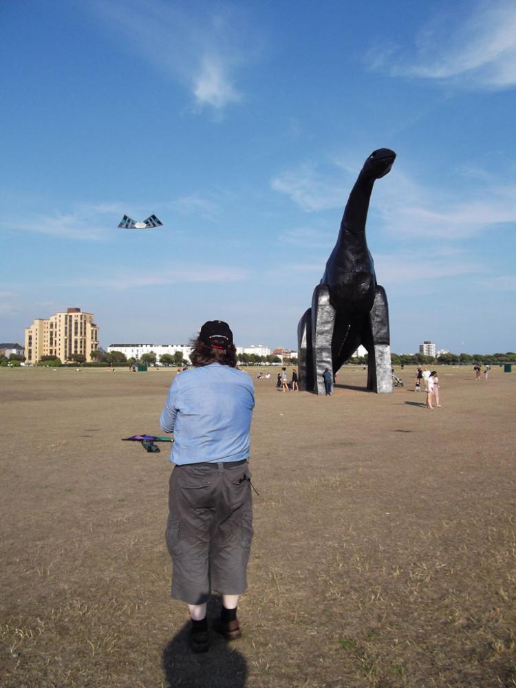 Flying close to the dinosaur whilst a gazebo passed in front of me and a group of families set up a barbecue.