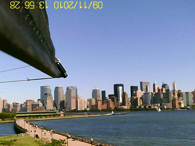 View of "Ground Zero" area of Manhattan from my kite. Shot on 9th aniversary of attacks, my leading edge points toward gap where World Trade Center once stood.
