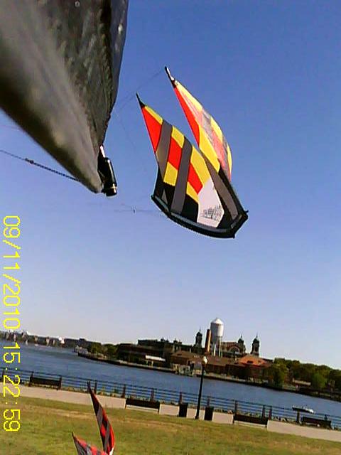 Rev KAP view from Laura's kite of (to to bottom) Wayne and Jose, and Ellis Island