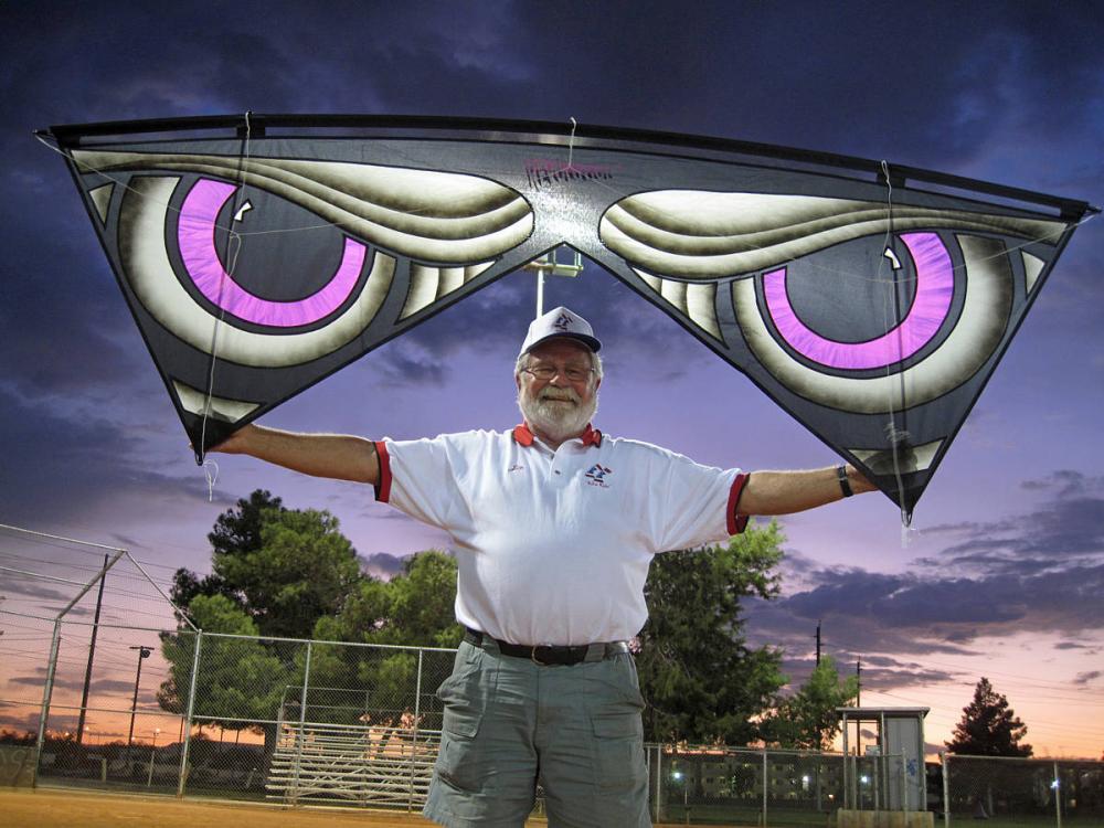 Something about the light right then, maybe it was the dark clouds and the golden sunset, not sure but something worked out perfectly to make these shots absolutely stunning! The lighting and composition of the photo works perfectly in bringing out the awesomeness of the Eyes. This one is being posed by Jim Foster. The two new kites are similar in colors but quite different from each other. I think I like this shot the best out of all of them. Thanks again Jim for modeling with this one.
