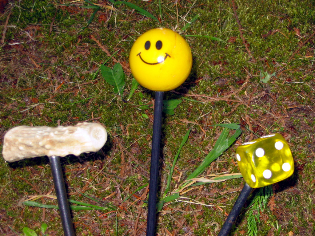 L-R a stake I won from Dan Whitney made out of a deer horn, a :) stake for sand and a dice stake.