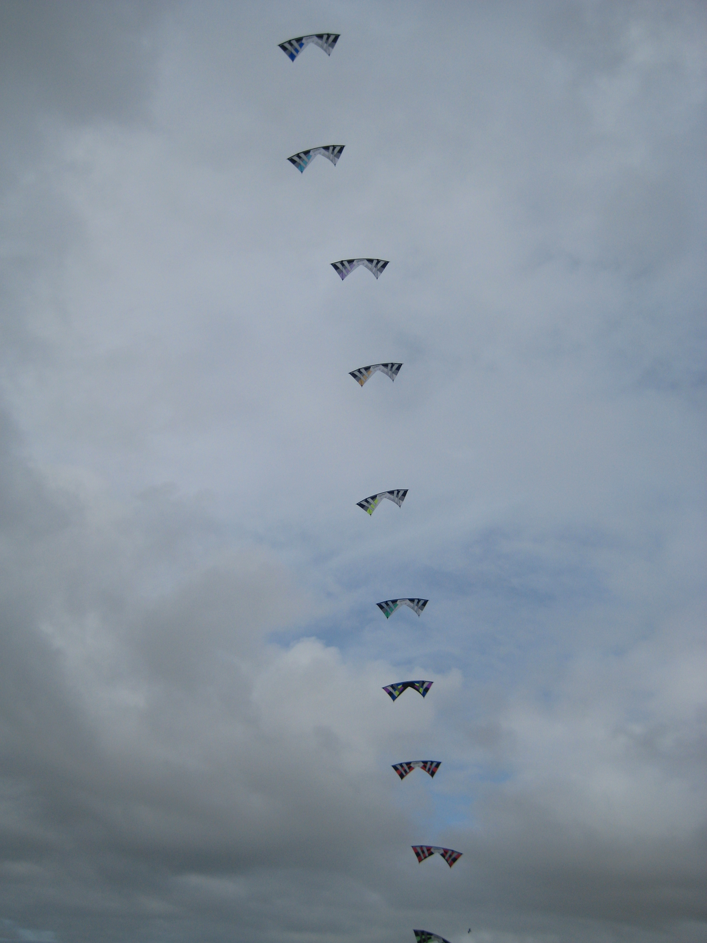 KiteLife Posted March 24, 2010 Author Report Share Posted March 24, 2010 Here's a photo of our 10-high kite column, just to give an idea of how much room we had to spare on 120' lines... Wind was 8-12mph, give or take. Photo courtesy of Erin Altenhof-Long Quote Link to comment Share on other sites More sharing options...