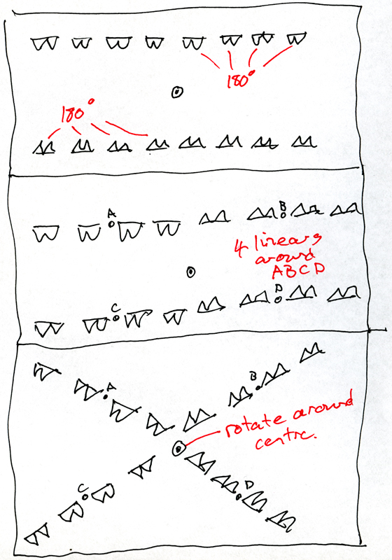Felix Posted December 3, 2010 Author Report Share Posted December 3, 2010 No problem with this one, at least for the animation. I can do the big pin wheel. From the big pinwheel I could create 4 mini pin wheels pivoting around the center of each group of four. From the two horizontal lines I could create a different version of 4 mini pinwheels. Ah ha! And from the 4 mini pinwheels how about a transition to diamonds or squares. Again the key thing will to be identify the appropriate groupings. Felix Quote Link to comment Share on other sites More sharing options...