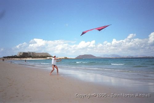 johnnmitchell Posted June 18, 2007 Author Report Share Posted June 18, 2007 Tip 1:There are two persons involved concerning this photo. The guy you see in the photo is me! What was I really doing? Tip 2: Look at photos on my web site at: www.johnnmitchell.com Check out the year 1995. Monday I will reveal be back and reveal the solution. I also have another photos awaiting you all. The Solution: The location was Fuerteventura in the Canary Islands on the North East Coast. The two hotels in the background are Olivia Beach and Tres Isles. In some photos you will see Lanzarote in the background. We were too far from African west coast to see it on that day. The other person involved concerning the photo was our cameraman Pierre Liskissas from Cosica(France). The purpose of this trip was creating a Kite Video Catalog for kite shops in Switzerland. Actually the REV did do about a 1/4 axel, but it was really a 3D throw. The wind was quite strong and carried the REV quickly to the end of the lines which were 100ft long. Even in the original negative, it is difficult to see the lines dipping down almost touching the water. The photo was made at about a 45 degree angle from me relative to the lines. I was really wearing original Speedos when I was in the water flying the REV. That comes from my days of competition swimming. The REV I is one of the first made after the logo changed from Neos Omega to Revolution. The spars were connected with stainless steel ferrule which had a slight bend in them. The 5 year old sail was almost destroyed with all of the this sea water flying pushing it. The REV was provided by the kite shop "Drachen Himmel" in Switzerland. I don't even have one that old. Fool(Chris Taylor) knew what was happening the first time around. Go to http://johnnmitchell.vlexo.com/3-Photograp...Fuerte1995.html to see more photos more of this flying. Quote Link to comment Share on other sites More sharing options...