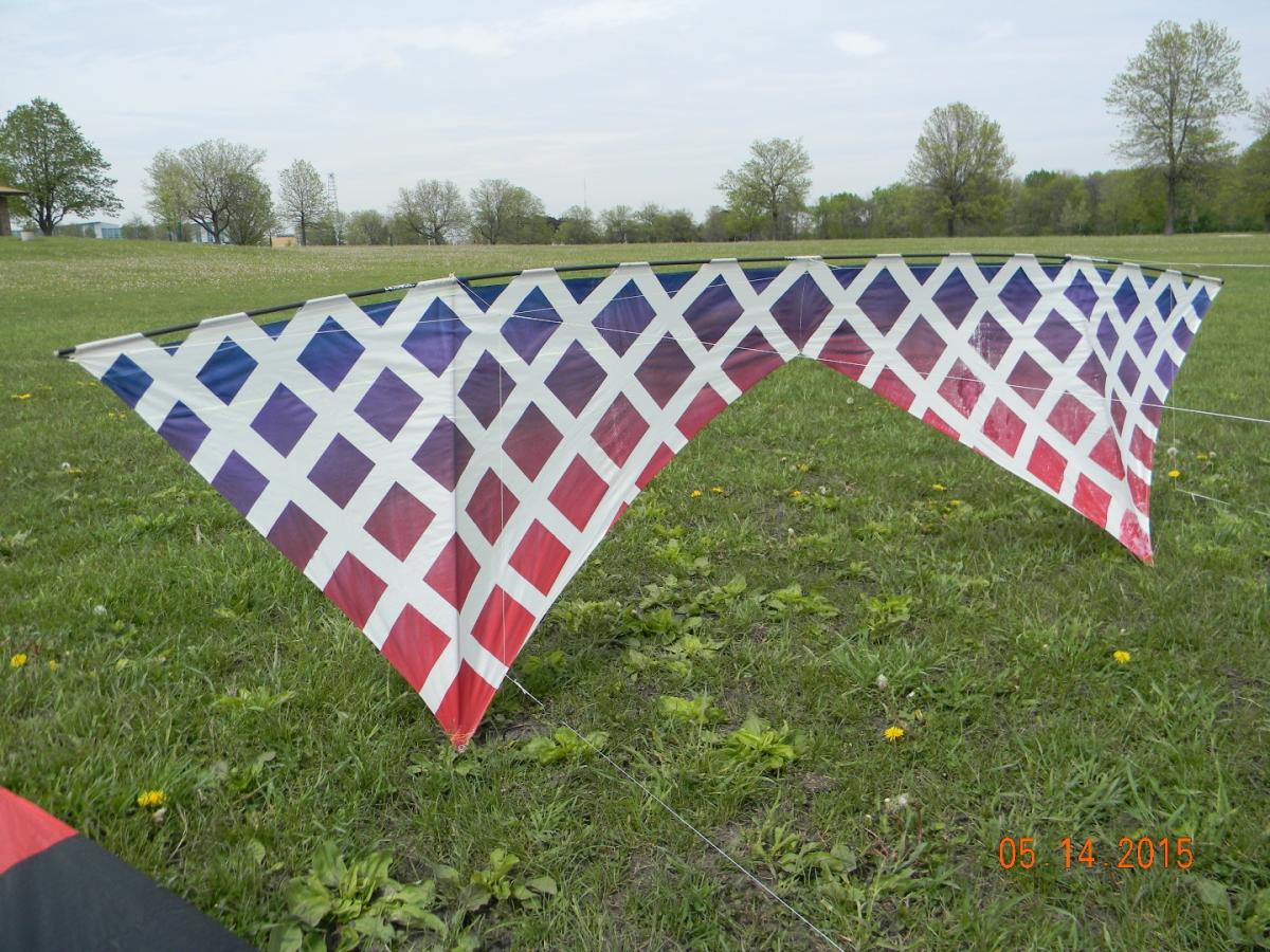 My bad -- the kite in the photos is a prototype. The vee will be much closer to square, which is where most of the extra 400 square inches of sail area will come from, although the prototype does not tend to bowtie as much as one would imagine just by its appearance. The sail is held tighter by the bow of the leading edge, which helps to keep both sides working together. You can see how much more it is bowed than the B-Pro standing behind it, with an almost straight leading edge. The frame is a hybrid, but I would have to check to see exactly what is where. I just used some spare tubes from other builds and got lucky, but plan on refining that to perfection also. I believe the LE outers are black race, Center may be two-wrap, Uprights are P90, but I would have to check to be sure. I just got a custom-sized diamond frame from Lolly a week ago that I want to use in the new version, depending on a few other variables, and it will have no bridle like an indoor.
